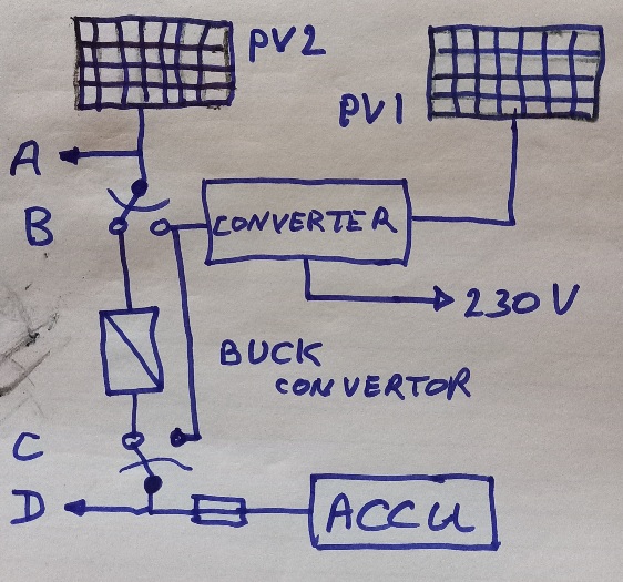 Met een solarpaneel van 450 Watt en een inverter van 700Watt wordt er bij mij op piekmomenten 500 Watt opgewekt. Met een tweede solar paneel erbij kan ik dat aangevuld tot 700 Watt, maar wat te doen met de 250 Watt overproductie? Met twee panelen kan in de vroege morgen en de late middag wel een hoger rendament gemaakt worden, maar op de piekmomenten kan die overproductie (1000 Watt) wel schade aanrichten.... Met een eenvoudig proces in bv een PLC schakelt het tweede paneel bijtijds om naar de accu's om deze te laden, om in de nachtelijke uren deze accu's de convertor de gespaarde energie weer nuttig te laten gebruiken. Het idee ligt nu nog op de tekentafel, maar wie weet.... binnenkort.